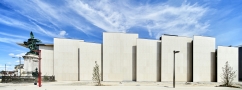 Ces grands plans sont réalisés en pierre. Ils composent les murs et les toitures. Ils sont rendus abstraits par leur minceur, composés de panneaux de 12cm d’épaisseur : pierre en parement et âme en nid d’abeille d’aluminium. Cette matière rigide offre à la pierre sa finesse.
